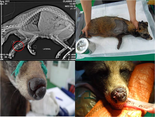 | 덫에 걸린 너구리. 오른쪽 앞다리가 골절되어 절단 수술을 진행하였고, 콧등 역시 찢어져 있어서 봉합을 해주었다. |